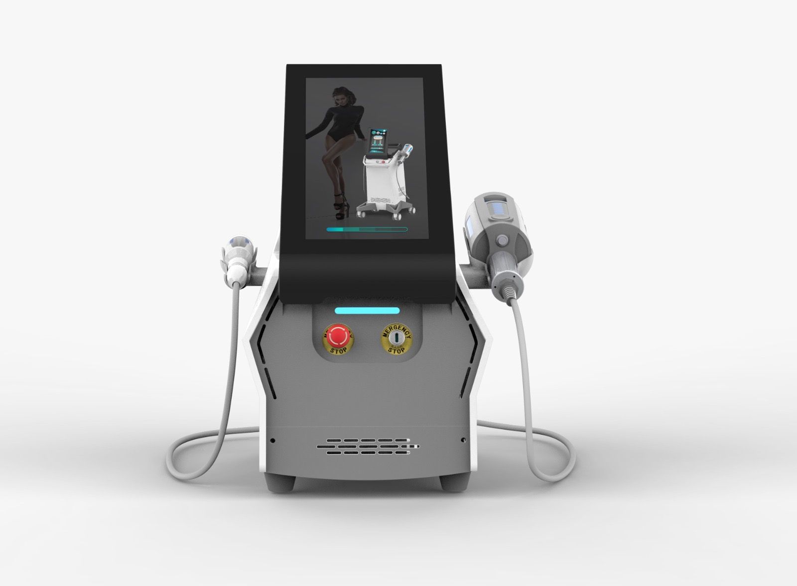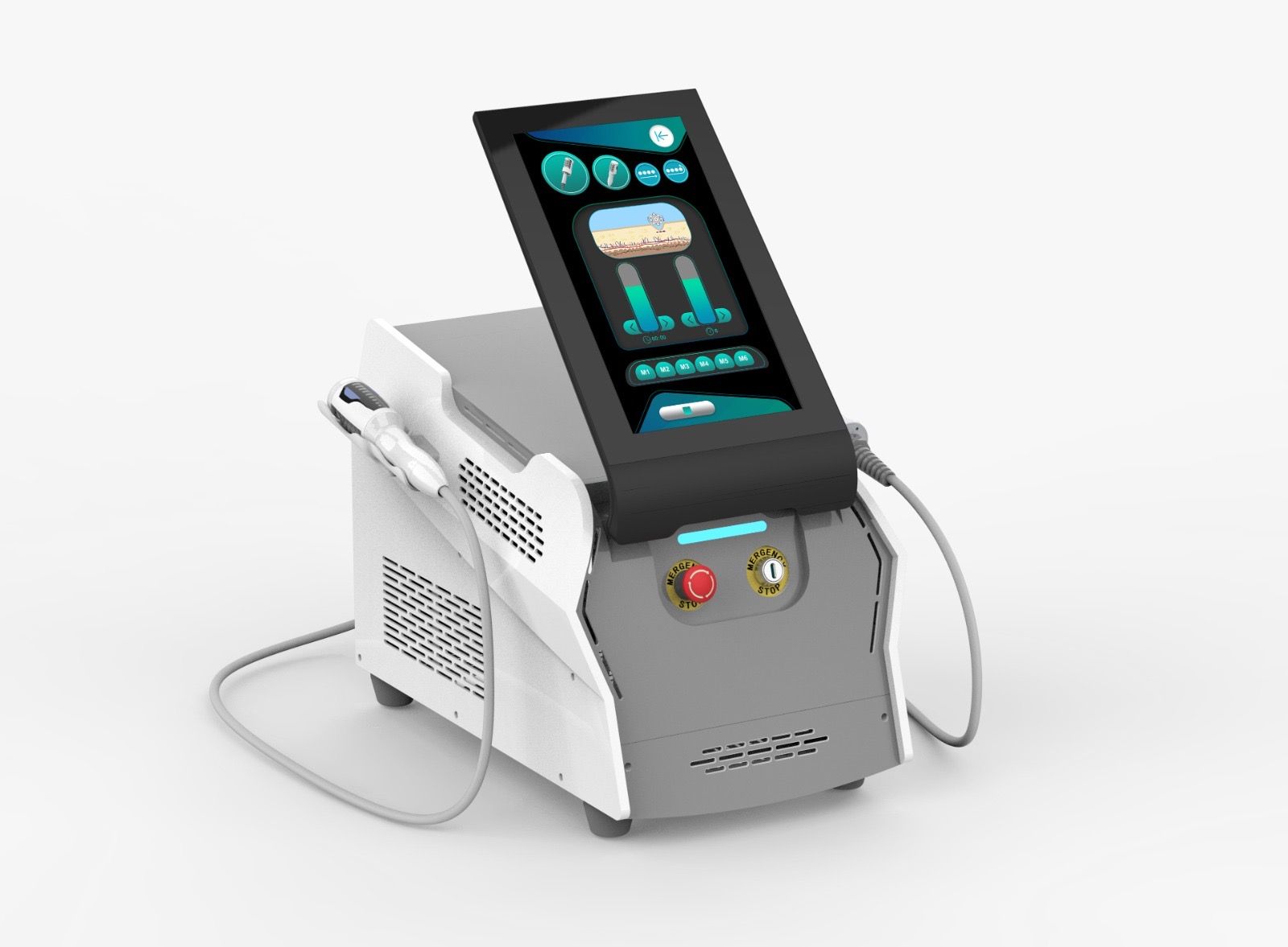 Incluye dos manipulos: uno corporal y uno facial, con velocidades programables según zona y uso. Su pantalla LCD táctil de 15,6 pulgadas permite control total de intensidad, velocidad, frecuencia y protocolos.