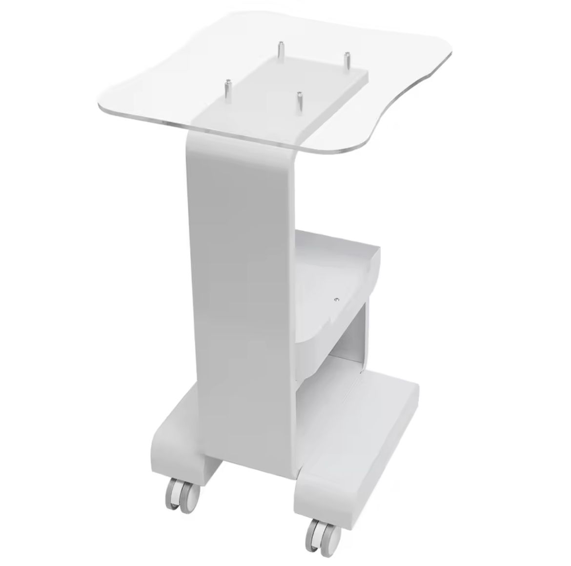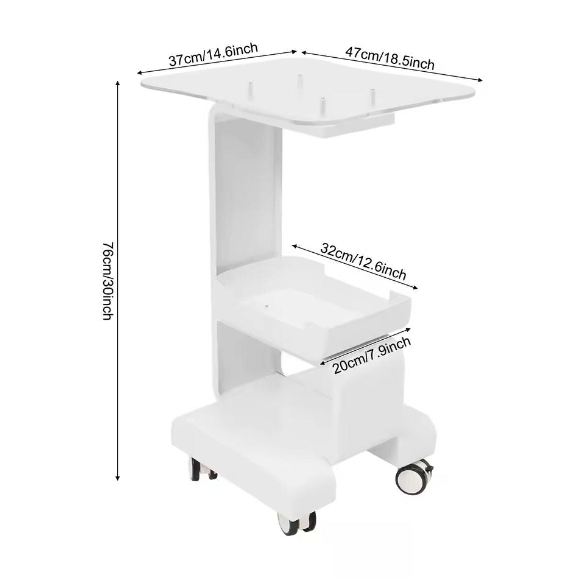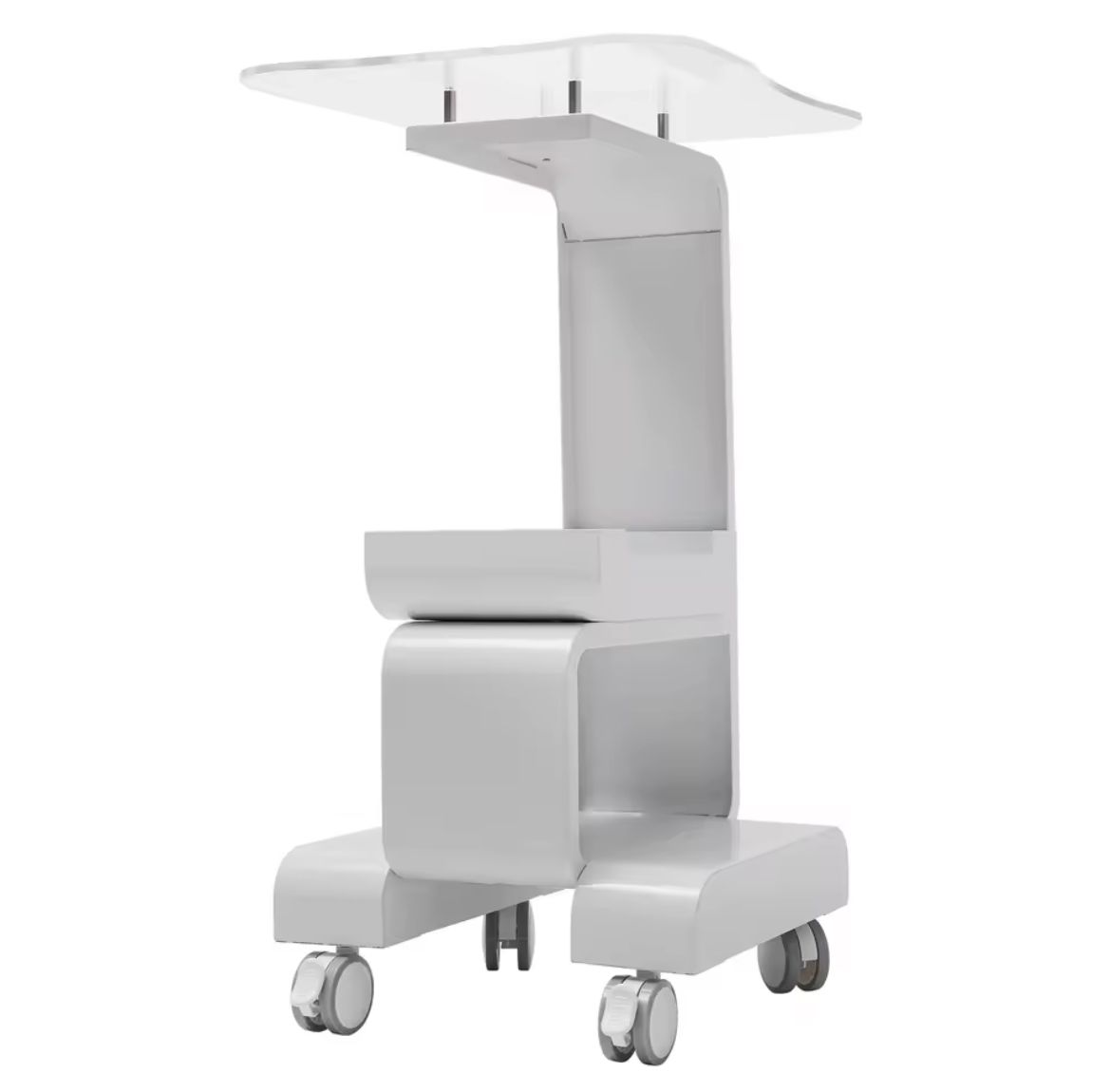 Carro profesional de estilo moderno, diseñado para soportar equipos de estética, belleza y medicina estética. Fabricado en metal y acrílico de alta resistencia, con estantes amplios y ruedas silenciosas que facilitan el movimiento en clínicas, salones de belleza y spas.