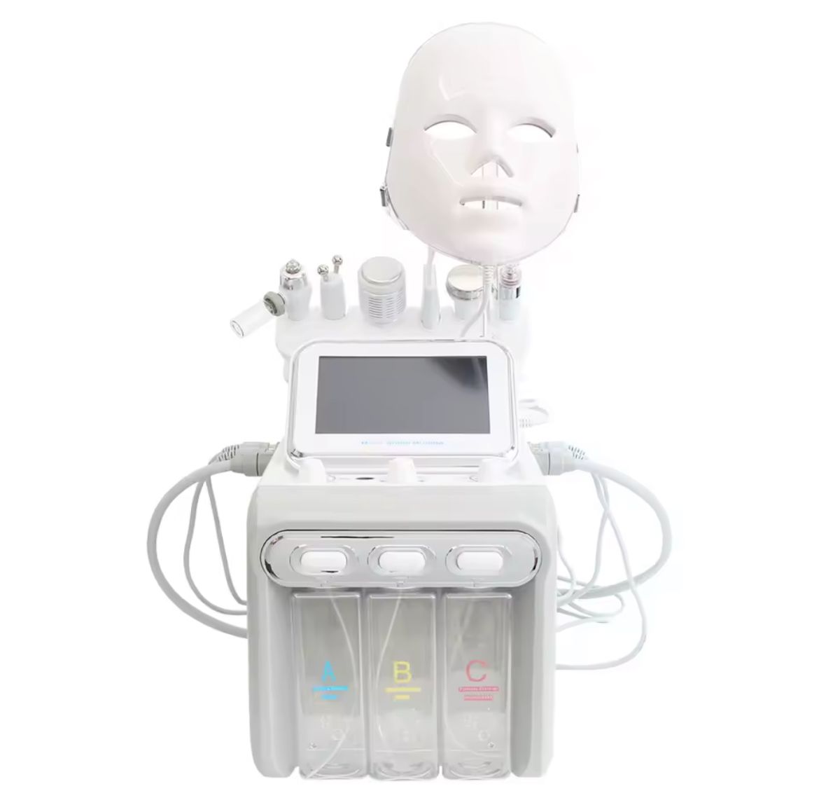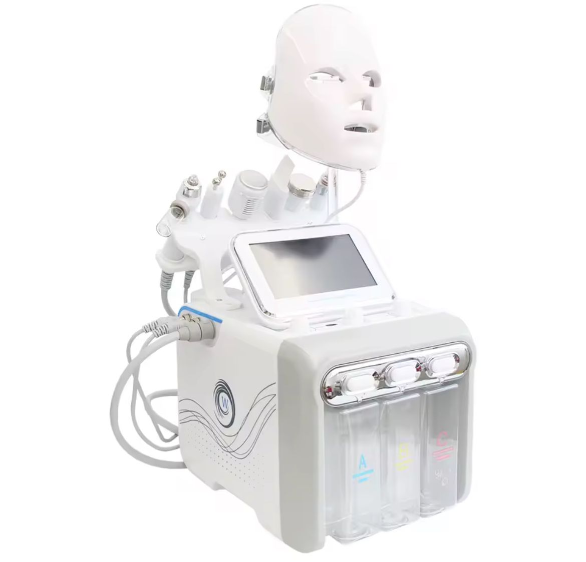 Equipo profesional 7 en 1 para tratamientos faciales completos: limpieza profunda, hidratación, rejuvenecimiento y cuidado avanzado de la piel con hidrodermoabrasión, radiofrecuencia, ultrasonidos y máscara LED de cromoterapia.