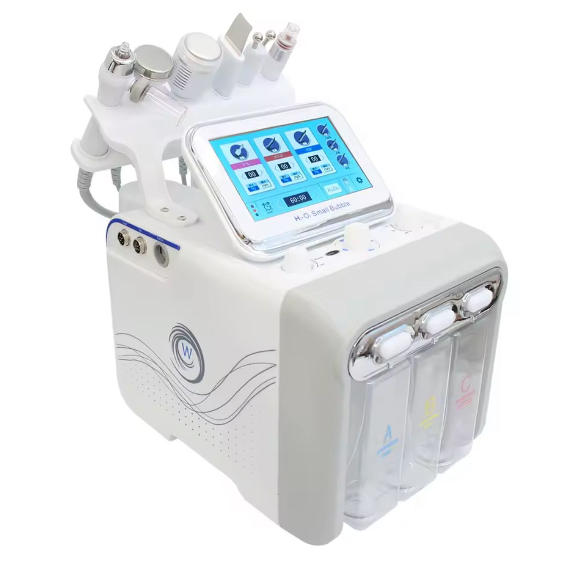Este equipo combina diferentes funciones en un solo dispositivo: hidrodermoabrasión, radiofrecuencia, ultrasonidos, bio microcorrientes, martillo frío, pulverizador y máscara LED de 7 colores, logrando resultados visibles desde la primera sesión.